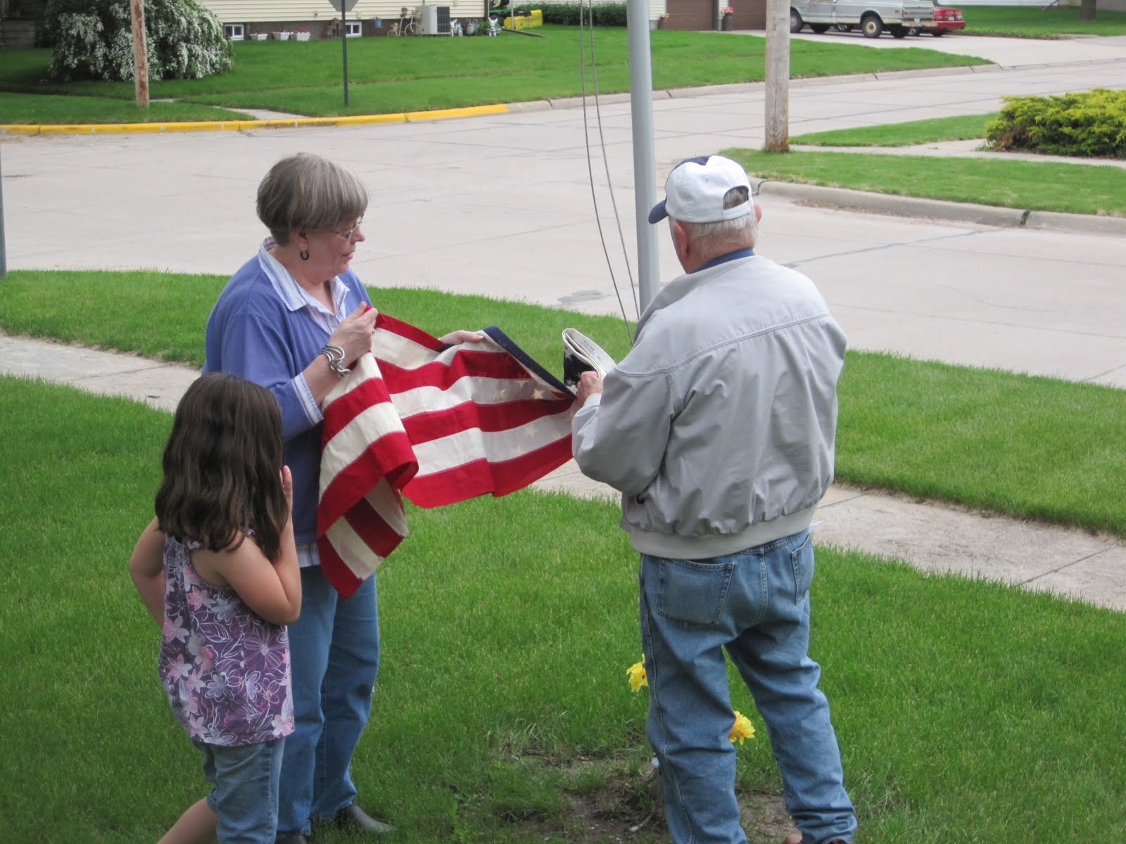 Mom & Dad got a new flag so Sonja and Harper helped Grandpa hang the flag. After we hung the flag we all stood back and said the Pledge of Alegents. Was touching to see how proud Dad was to hang his new flag.